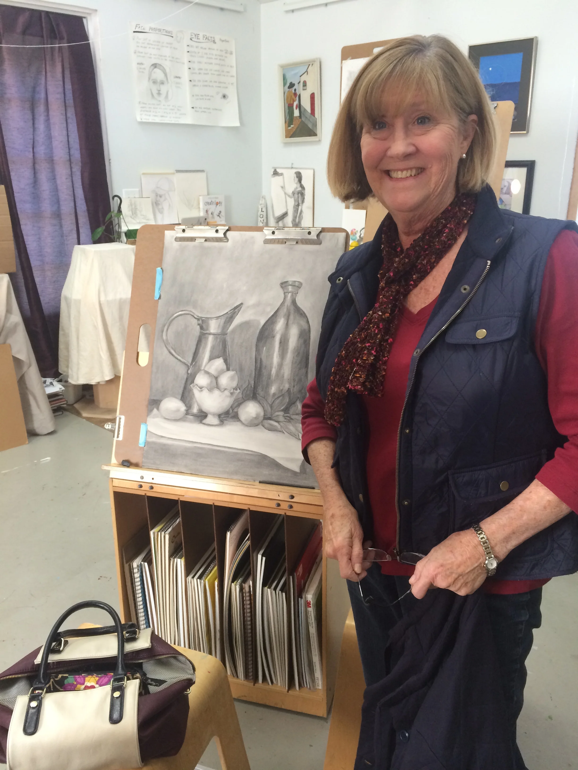Photo of Dona with her charcoal still-life drawing